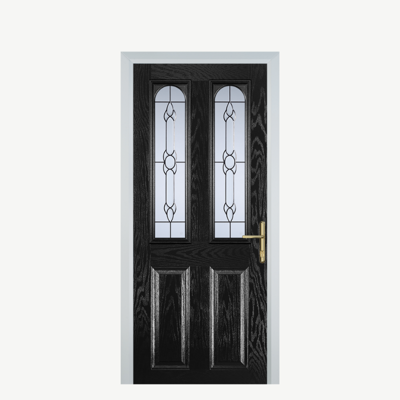Introducing the Door A 2 Panel 2 Arch Black Crystal Bohemia, a stunning addition to any home that combines elegance with functionality. This exquisite composite front door is designed not only to enhance your property's curb appeal but also to provide security and insulation. Crafted with precision, it showcases a sophisticated black finish paired with eye-catching crystal accents.