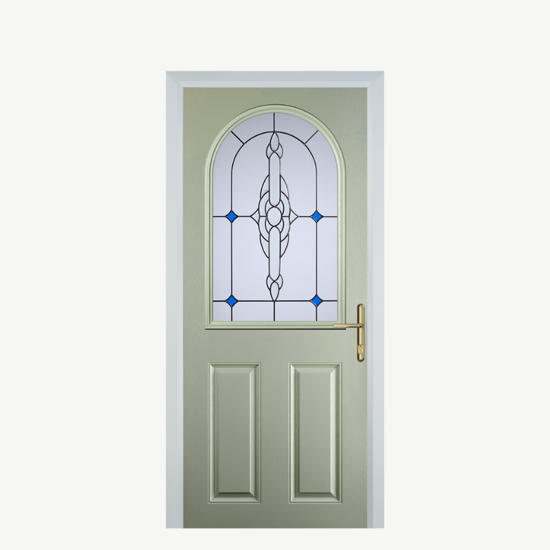 Introducing the Door E 2 Panel 1 Arch in Pebble Grey Crystal Bohemia Blue, a stunning addition to your home that seamlessly blends style and functionality. This exquisite front door is designed to enhance curb appeal while providing superior security and energy efficiency. Crafted with precision, it stands as a testament to modern design and durability.