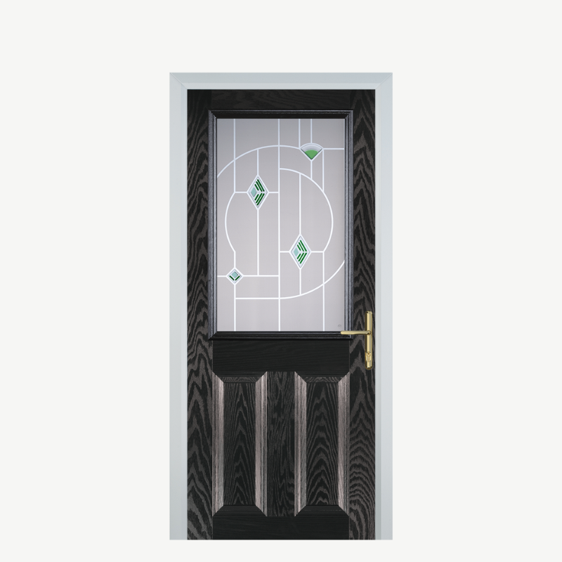 Introducing the Door F 2 Panel 1 Square in Black Brown with Murano Green accents, a striking addition to your home that combines elegance with functionality. This composite front door is designed not only to enhance your property's curb appeal but also to provide superior durability and security.