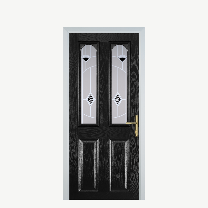 Introducing the Door A 2 Panel 2 Arch Black Murano Black, a striking composite front door that combines elegance with durability. Ideal for homeowners seeking a modern aesthetic, this door not only enhances curb appeal but also provides security and insulation.