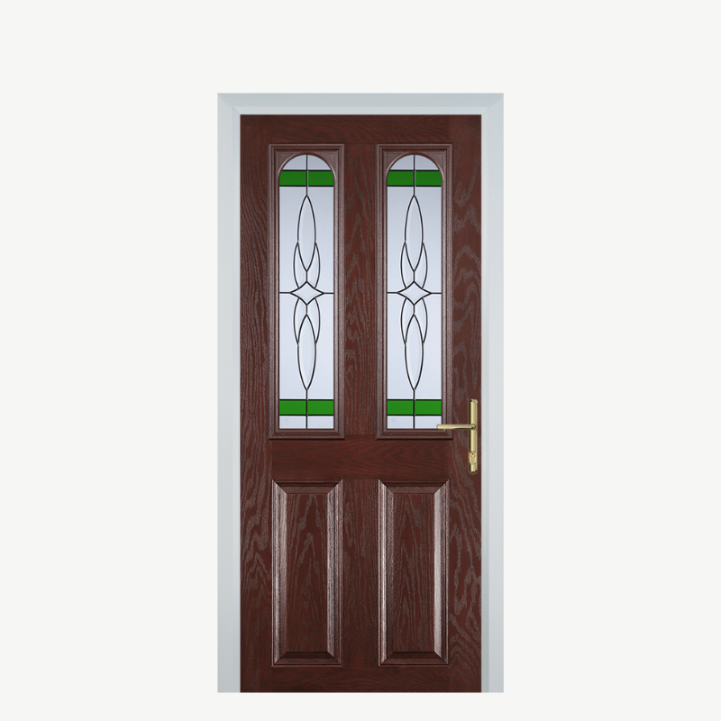 Refresh your entrance with the Door A 2 Panel 2 Arch Dark Wood Crystal Harmony Green, fitted by UK Composite Doors. This dark wood finish with green crystal harmony detailing brings natural, rich appeal, paired with composite strengths: incredible strength to resist wear, top-tier insulation for a cozy home, and advanced security for protection. Easy to maintain and eco-friendly, it’s a stylish, durable choice. Opt for our supply only option if you’d like to install it yourself.