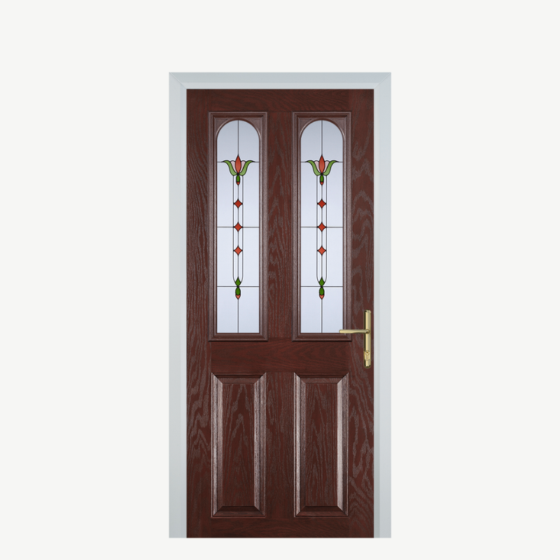 Infuse floral richness with the Door A 2 Panel 2 Arch Dark Wood Fleur, fitted by UK Composite Doors. This dark wood finish with fleur detailing offers a warm, classic charm, paired with composite advantages: incredible strength to resist wear, top-tier insulation for a cozy home, and advanced security for protection. Easy to maintain and refined, it’s a stylish, durable upgrade. Choose our supply only option for DIY flexibility.