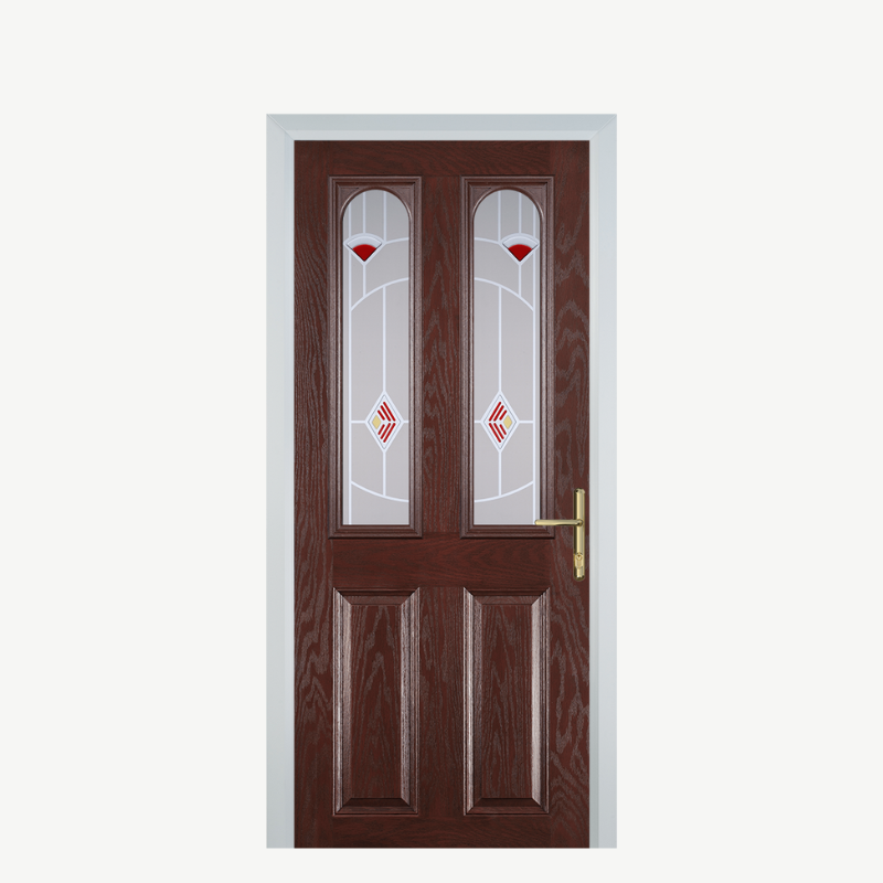 Add artistic richness with the Door A 2 Panel 2 Arch Dark Wood Mackintosh Rose, fitted by UK Composite Doors. This dark wood finish with Mackintosh rose detailing brings a warm, elegant vibe, enhanced by composite strengths: exceptional strength to resist damage, top-tier insulation for a cozy interior, and advanced security for protection. Easy to maintain and refined, it’s a stylish, dependable choice. Available as a supply only option for self-installers.