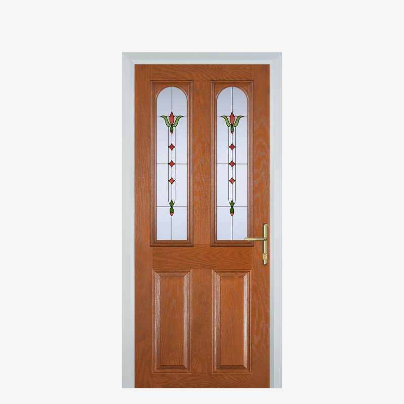 Infuse floral elegance with the Door A 2 Panel 2 Arch Oak Fleur, fitted by UK Composite Doors. This oak finish with fleur detailing offers a classic, warm charm, enhanced by composite advantages: exceptional resilience to the elements, top-tier insulation for a warm interior, and advanced security for safety. Easy to maintain and refined, it’s a stylish, dependable upgrade. Available as a supply only option for self-installers.