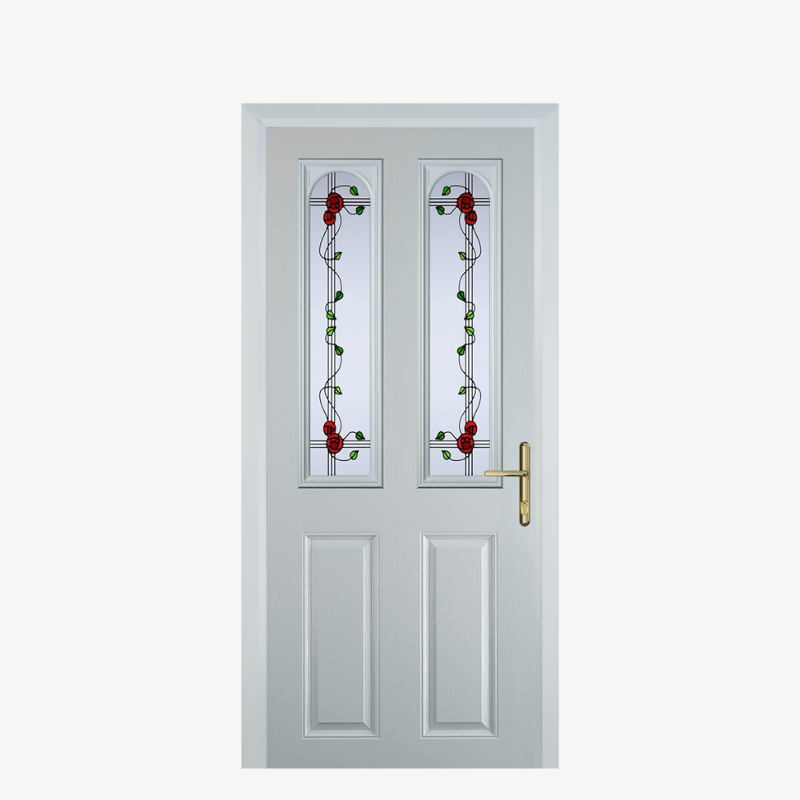 Add artistic charm with the Door A 2 Panel 2 Arch White Mackintosh Rose, fitted by UK Composite Doors. This white finish with Mackintosh rose detailing brings a classic, elegant vibe, paired with composite strengths: exceptional resilience to the weather, top-tier insulation for a snug interior, and advanced security for safety. Easy to maintain and sophisticated, it’s a timeless, durable choice. Opt for our supply only option if you’d like to install it yourself.