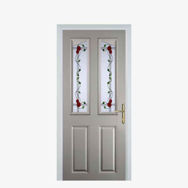 Introducing the "Door B 2 Panel 2 Angle Agate Grey Mackintosh Rose," an exquisite addition to your home's entryway that combines elegance with durability. This composite front door is designed to elevate your property's curb appeal while providing robust security and insulation.