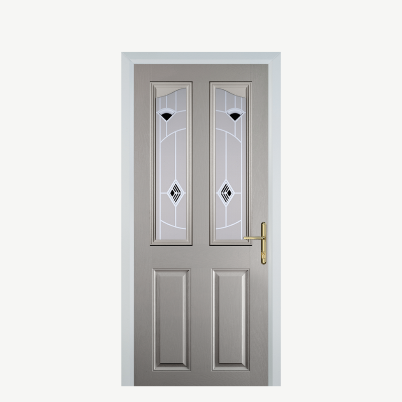 Introducing the Door B 2 Panel 2 Angle in Agate Grey with Murano Black accents, a perfect blend of elegance and functionality for your home. This composite front door is designed to enhance your entryway while providing superior security and durability.