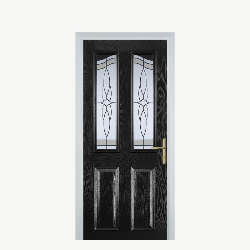 Introducing the Door B 2 Panel 2 Angle Black Crystal Harmony Frost, a stunning addition to any home that seamlessly blends style and functionality. This composite front door is designed to enhance your entrance with an elegant black finish while providing durability and security.