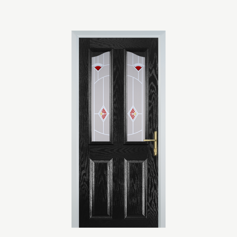 Introducing the Door B 2 Panel 2 Angle Black Murano Red, a stunning addition to any home that perfectly marries style and functionality. This composite front door is designed to enhance your entryway while providing the durability and security you need. Its striking black finish complemented by Murano red accents makes it a statement piece that sets the tone for your entire home.