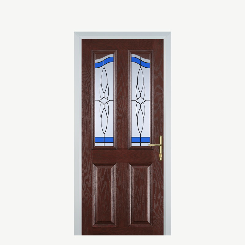 Introducing the Door B 2 Panel 2 Angle Dark Wood Crystal Harmony Blue, a stunning blend of elegance and functionality designed to enhance your home's entrance. This premium composite front door not only offers superior security and durability but also elevates your curb appeal with its striking blue color and sophisticated design.