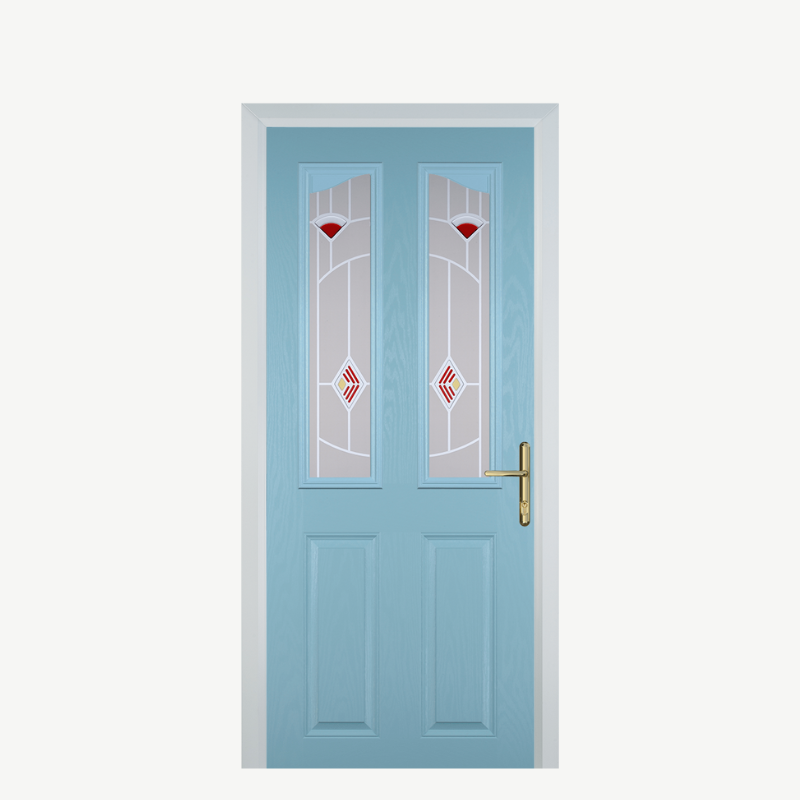 Introducing the Door B 2 Panel 2 Angle in a serene Duck Egg Blue, complemented by the striking Murano Red accents. This composite front door is designed to elevate the entrance of your home while providing exceptional durability and style. Perfect for those seeking a blend of modern aesthetics with traditional charm, this door is not just an entryway, but a statement piece.
