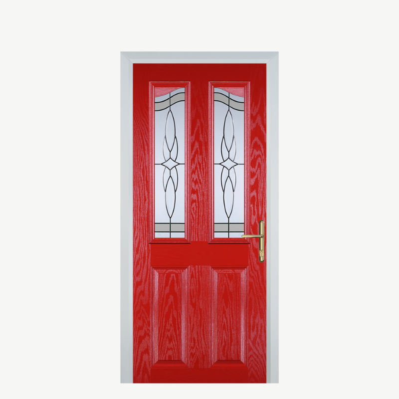 Introducing the Door B 2 Panel 2 Angle in Poppy Red (High Gloss) Crystal Harmony Frost, a stunning addition to your home that seamlessly combines style and security. This composite front door not only enhances your home's curb appeal but also provides exceptional performance and durability.