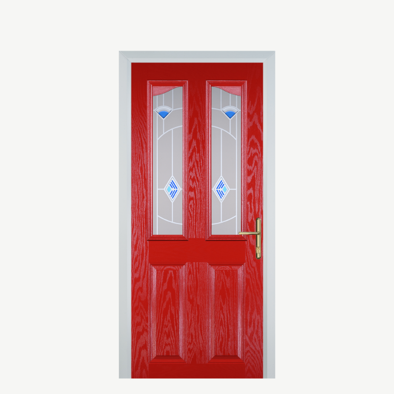 Introducing the Door B 2 Panel 2 Angle in striking Poppy Red (High Gloss) Murano Blue, a perfect blend of style and functionality for your entrance. This stunning composite front door not only enhances curb appeal but also provides superior durability and security, making it an ideal choice for any modern home.