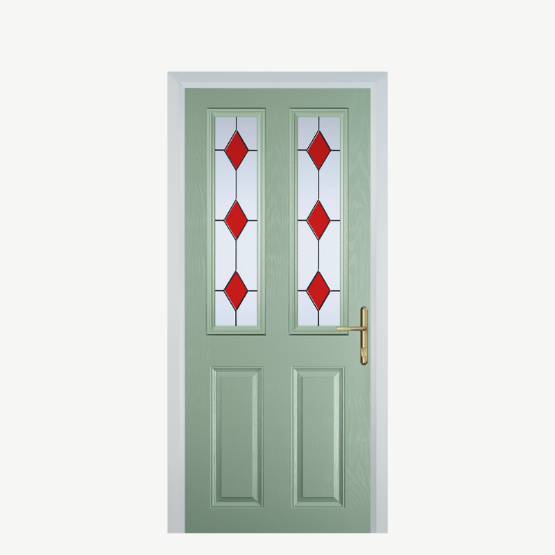 Introducing the Door C 2 Panel 2 Square in Chartwell Green, a stunning composite front door that combines elegance and durability. This door not only enhances your home's curb appeal but also ensures security and energy efficiency. Its unique design features a charming two-panel layout with square panels and a striking red diamond motif, making it a focal point of your entrance.