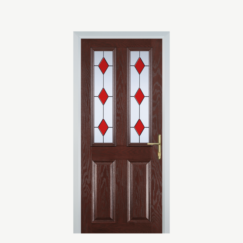 Introducing the Door C 2 Panel 2 Square Dark Wood 3 Drop Diamond Red, a stunning combination of style and functionality that enhances the entryway of any home. This composite front door is designed to make a statement, offering an inviting ambiance while ensuring durability and security.