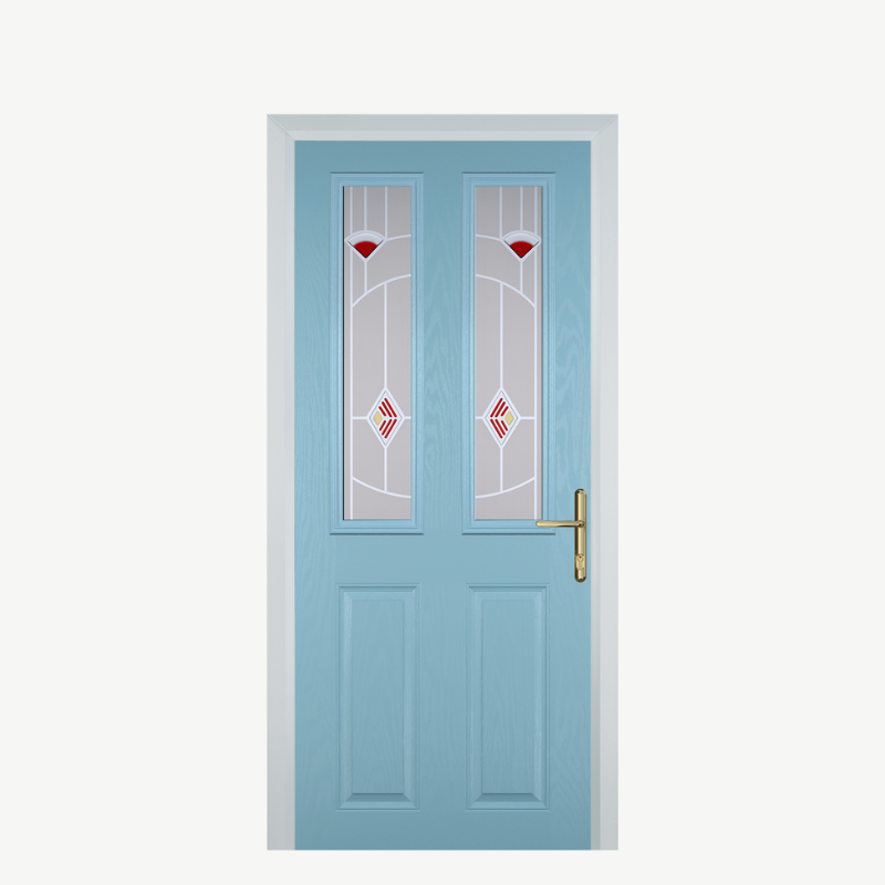Introducing the stunning Door C 2 Panel 2 Square in Duck Egg Blue with Murano Red accents, a perfect blend of elegance and functionality for your home. This composite front door not only enhances your property's curb appeal but also provides exceptional durability and security. Designed to stand out, it combines modern aesthetics with traditional craftsmanship.