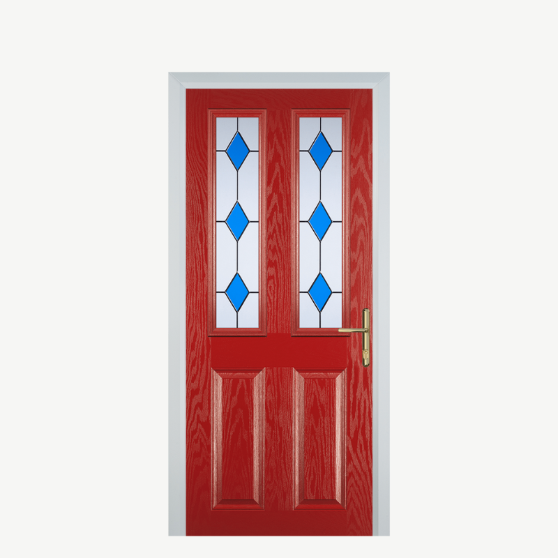 Introducing the Door C 2 Panel 2 Square in striking red with exquisite blue drop diamonds, a perfect blend of style and functionality for your home. This composite front door offers a sophisticated entrance, enhancing curb appeal while providing robust security and energy efficiency.