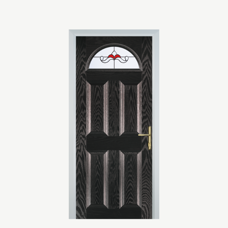 Introducing the Door D 4 Panel 1 Arch Black Brown Crystal Bohemia Red, a stunning addition to any home. This composite front door combines elegance and durability, making it the perfect entryway to enhance your home's aesthetic while providing security and insulation.