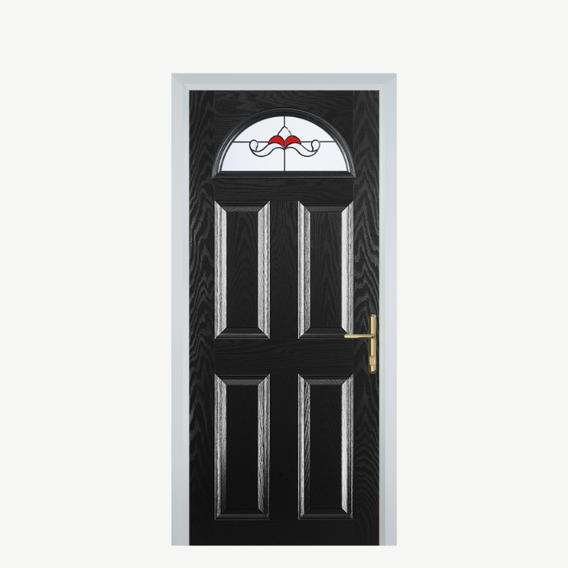 Introducing the Door D 4 Panel 1 Arch Black Crystal Bohemia Red, a stunning combination of elegance and durability designed to enhance the entrance of your home. This composite front door not only provides superior security but also adds a touch of sophistication to your property.