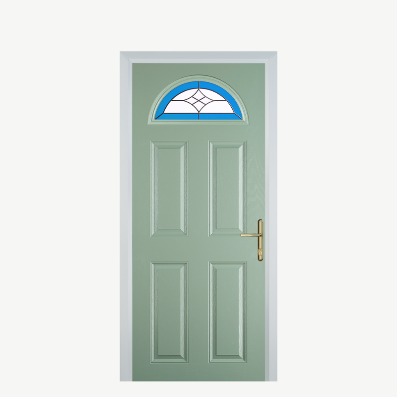 Introducing the Door D 4 Panel 1 Arch in Chartwell Green with Crystal Harmony Blue accents, an exquisite addition to your home that combines elegance and functionality. This composite front door not only enhances your home's curb appeal but also provides security and durability.
