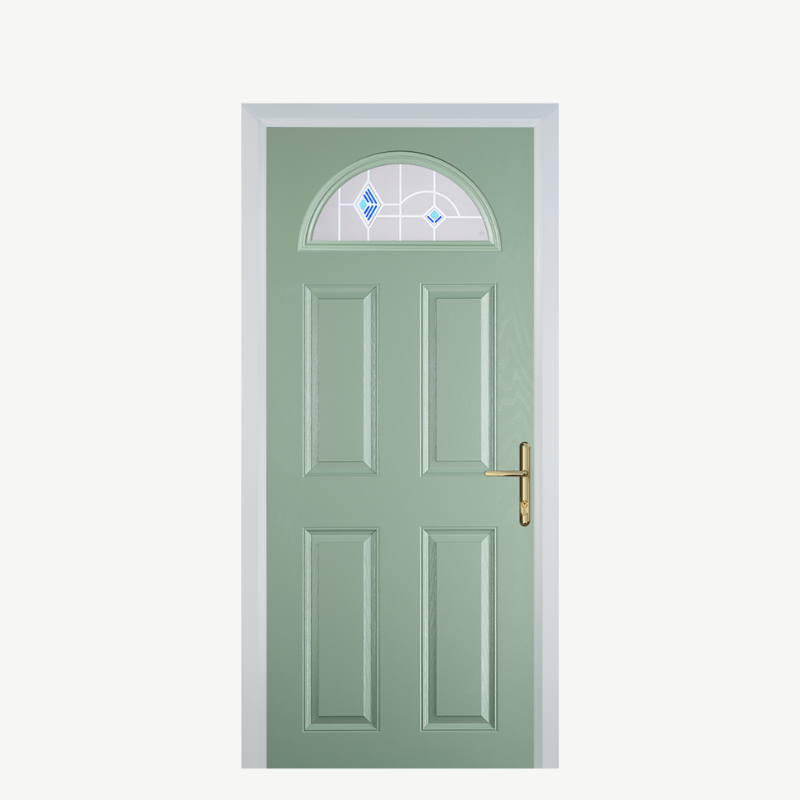 Introducing the Door D 4 Panel 1 Arch in Chartwell Green and Murano Blue, a striking addition to your home that expertly combines elegance and functionality. This composite front door is designed not only to enhance your curb appeal but also to provide exceptional durability and security.