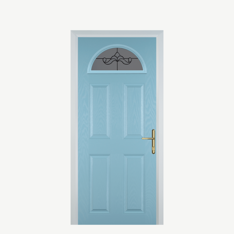 For maintenance, simply clean with a damp cloth and mild detergent. The composite material is designed to withstand the elements, making it a low-maintenance option. Transform your entrance with the Door D 4 Panel 1 Arch Duck Egg Blue Crystal Bohemia Frost today.