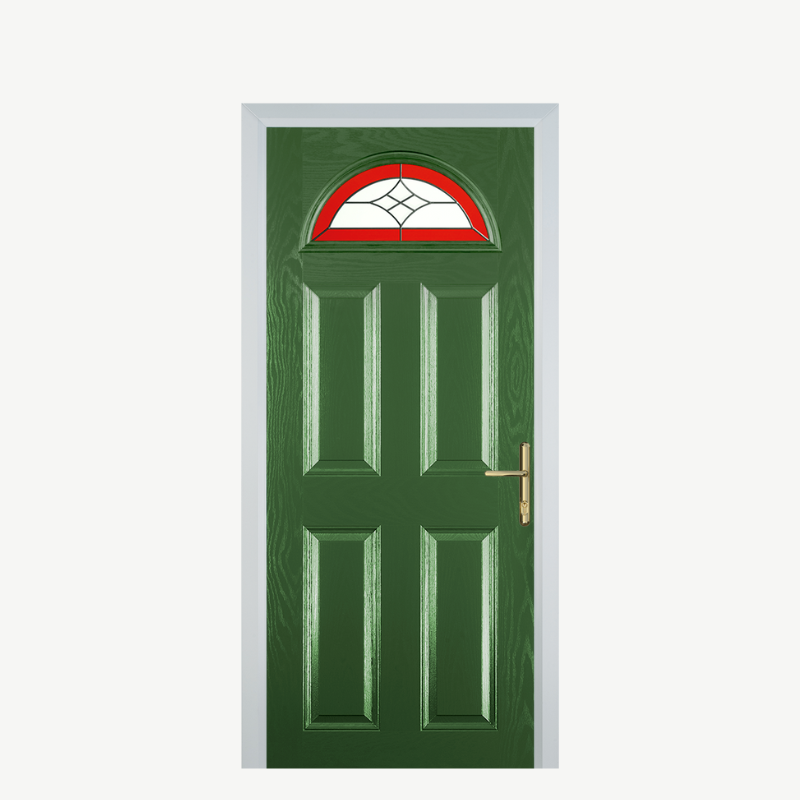 Introducing the "Door D 4 Panel 1 Arch Fern Green Crystal Harmony Red," a stunning composite front door that combines elegance and durability. This door not only enhances the aesthetic appeal of your home but also provides exceptional security and insulation, making it an ideal choice for any entryway.