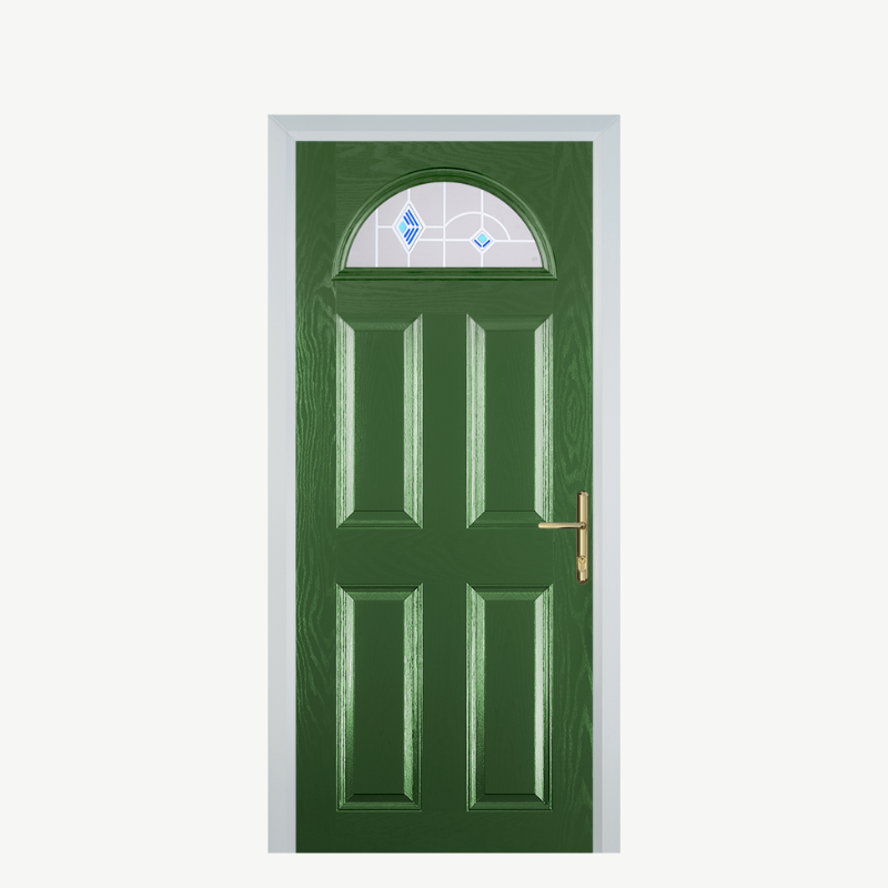 Introducing the stunning Door D 4 Panel 1 Arch in a captivating Fern Green with Murano Blue accents. This composite front door is designed to make a bold statement while providing security and energy efficiency for your home. Perfect for those seeking a combination of elegance and durability, this door enhances your curb appeal and complements various architectural styles.