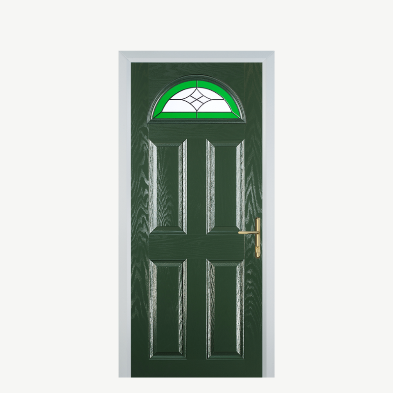 Introducing the Door D 4 Panel 1 Arch Green Crystal Harmony Green, the perfect blend of style and functionality for your entrance. Designed to elevate the curb appeal of your home, this composite front door exudes elegance while ensuring durability and security.