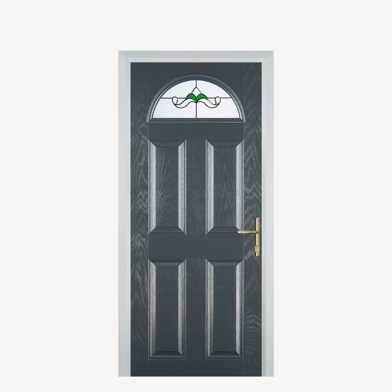 Introducing the Door D 4 Panel 1 Arch Grey Crystal Bohemia Green, a striking addition to your home that seamlessly blends style and functionality. This expertly designed composite front door not only enhances your home's curb appeal but also offers robust security and energy efficiency.
