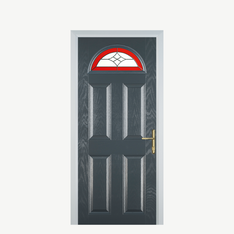 Introducing the Door D 4 Panel 1 Arch in Grey Crystal Harmony Red, a stunning addition to any home that combines elegance with functionality. This composite front door is designed not only to enhance your property's curb appeal but also to provide security and durability.