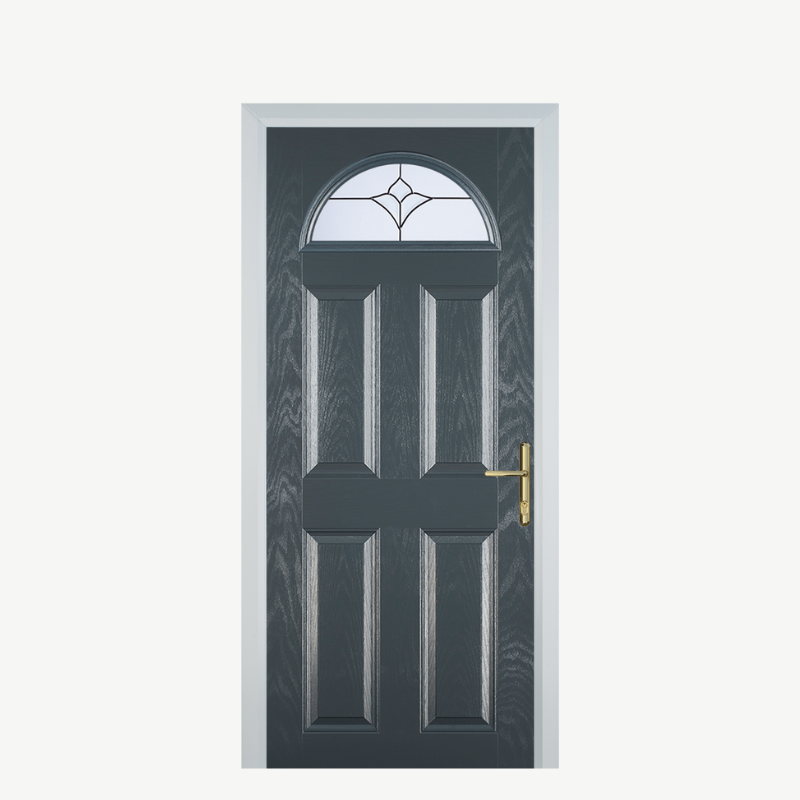 Introducing the Door D 4 Panel 1 Arch Grey Crystal Tulip Arch, a stunning addition to your home that seamlessly blends style with functionality. This composite front door is designed to enhance the entrance of your property while providing durability and security.