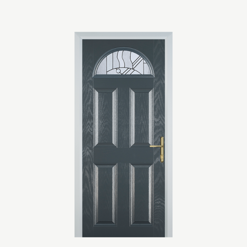 Introducing the Door D 4 Panel 1 Arch Grey Zinc Art Abstract, an exquisite blend of modern design and functional elegance. This composite front door is designed to make a striking first impression while providing durability and security for your home. Its unique abstract zinc art detailing adds a contemporary flair that enhances any entrance.