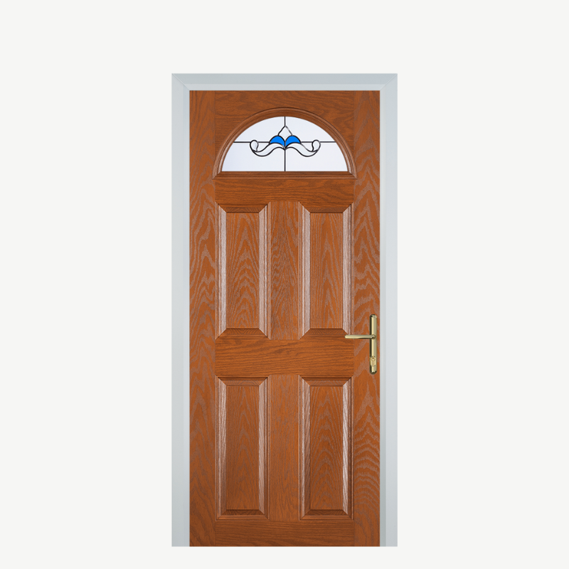 Introducing the Door D 4 Panel 1 Arch Oak Crystal Bohemia Blue, a stunning blend of elegance and functionality designed to enhance the entrance of your home. This composite front door not only serves as a robust barrier but also makes a bold aesthetic statement with its captivating blue hue and sophisticated arch design.