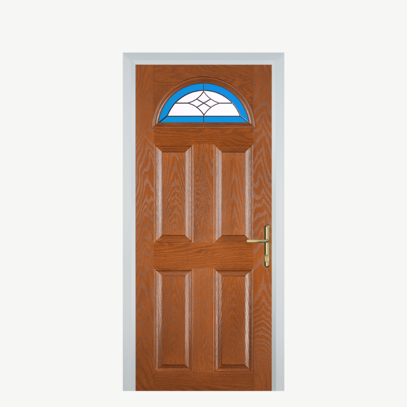 Introducing the Door D 4 Panel 1 Arch Oak Crystal Harmony Blue, a striking addition to any home that blends modern design with classic elegance. This composite front door not only enhances your home's curb appeal but also provides security and durability, making it an ideal choice for discerning homeowners.