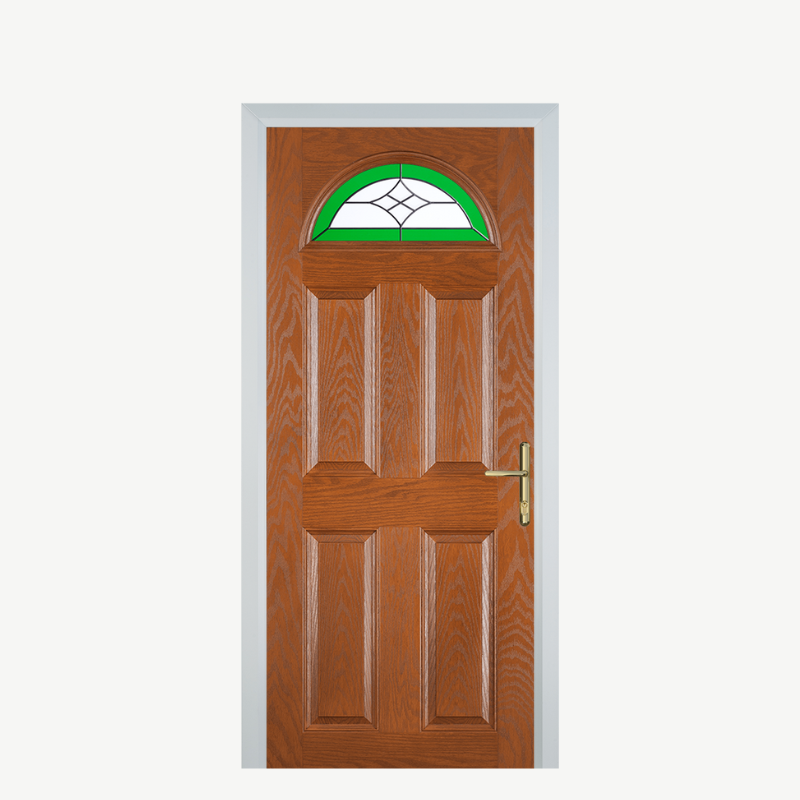 Introducing the Door D 4 Panel 1 Arch Oak Crystal Harmony Green, an elegant and functional addition to any home. This composite front door combines the timeless beauty of oak with a striking green finish, making it not only a functional entryway but also a stunning focal point for your property.