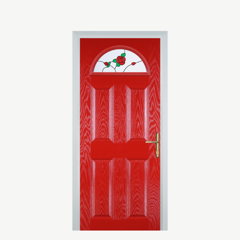 Introducing the Door D 4 Panel 1 Arch in Poppy Red (High Gloss) English Rose, a stunning addition to any home that combines elegance with functionality. This beautifully designed composite front door not only enhances curb appeal but also provides superior security and insulation.