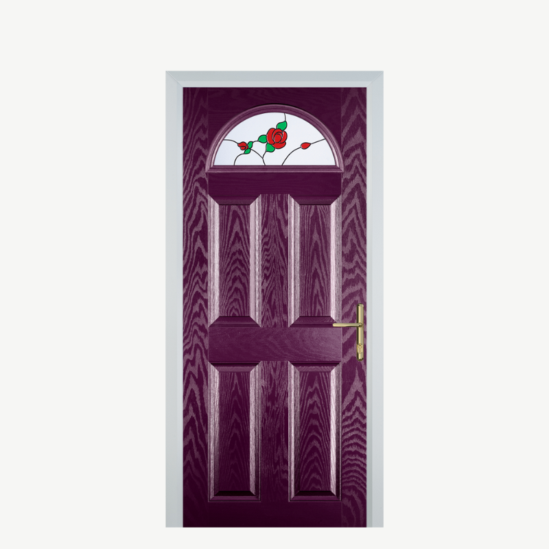 Introducing the Door D 4 Panel 1 Arch in a stunning Purple Violet English Rose finish. This exquisite composite front door is designed to enhance your home’s entrance with a blend of elegance and durability. Perfect for homeowners looking to make a statement, this door combines aesthetic appeal with practical functionality.