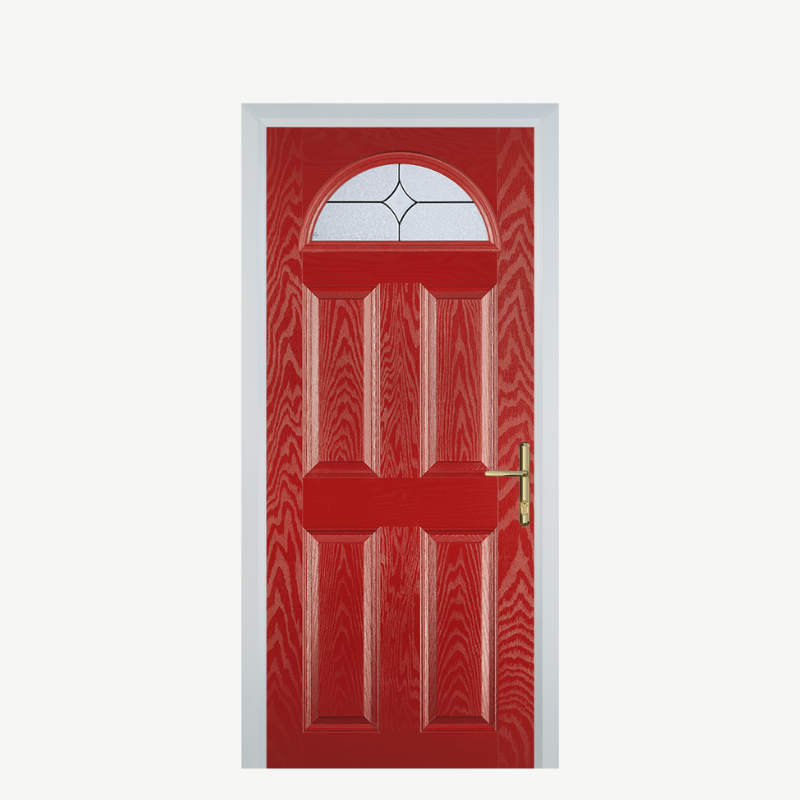 Introducing the "Door D 4 Panel 1 Arch Red Flair," a stunning addition to your home that seamlessly combines style and functionality. This eye-catching composite front door not only enhances your exterior aesthetics but also offers superior durability and security.