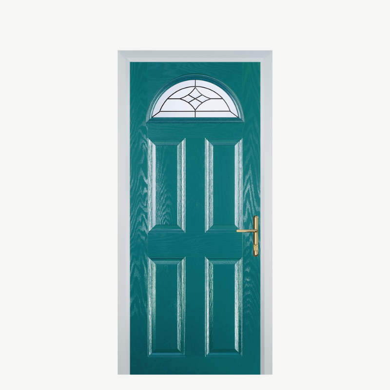 Introducing the Door D 4 Panel 1 Arch in an exquisite Turquoise Blue Crystal Harmony Frost finish. This stunning composite front door combines elegance and durability, making it the perfect statement piece for any home. Designed to enhance curb appeal while providing exceptional security, this door is a blend of style and practicality.