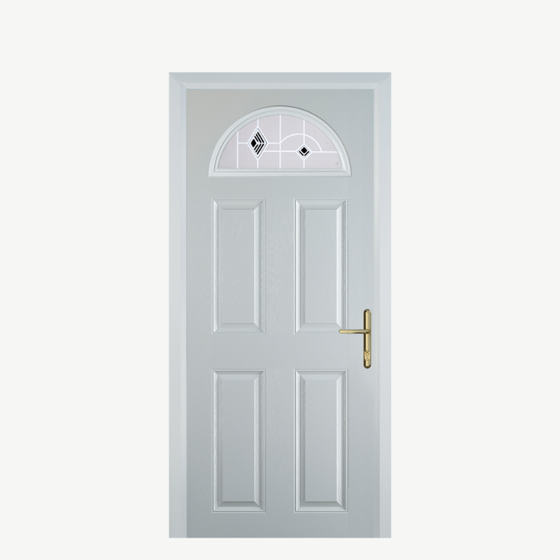 Introducing the Door D 4 Panel 1 Arch in White with Murano Black accents, an ideal choice for those seeking a perfect blend of style, security, and functionality for their home. This composite front door not only enhances your property's curb appeal but also offers exceptional durability and performance.