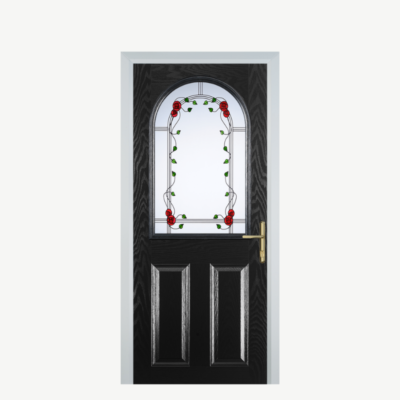 Introducing the Door E 2 Panel 1 Arch Black Mackintosh Rose, a stunning addition to any home looking to blend elegance with durability. This composite front door not only enhances your property's curb appeal but also provides exceptional security and insulation.