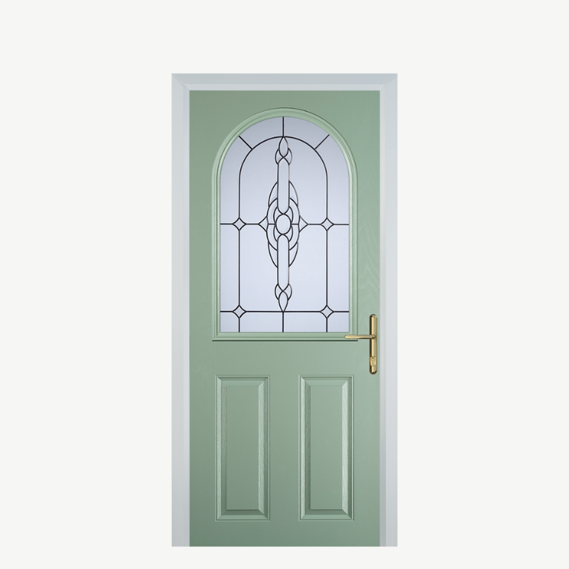 Introducing the Door E 2 Panel 1 Arch in Chartwell Green Crystal Bohemia Frost – a stunning addition to your home that combines elegance with durability. This composite front door not only enhances your home's curb appeal but also provides exceptional security and insulation.