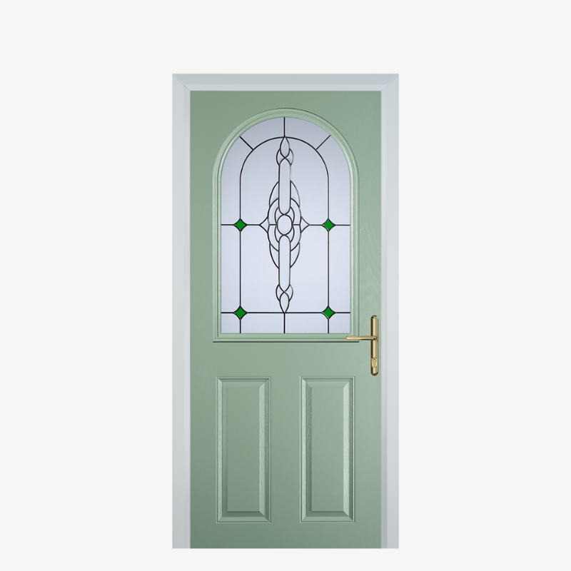 Introducing the Door E 2 Panel 1 Arch in a stunning Chartwell Green finish, a perfect blend of style and durability. Designed to enhance the entrance of your home, this composite front door embodies elegance while providing exceptional security and insulation.