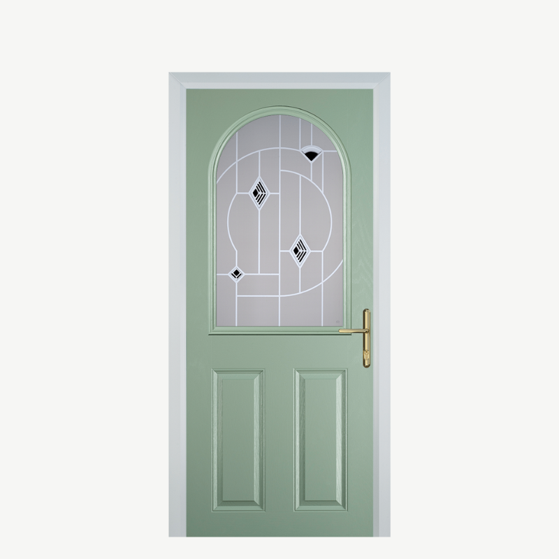 Introducing the Door E 2 Panel 1 Arch in Chartwell Green with Murano Black accents, a stunning addition to your home that combines elegance and functionality. This composite front door is designed to enhance your entrance while providing exceptional security and insulation.