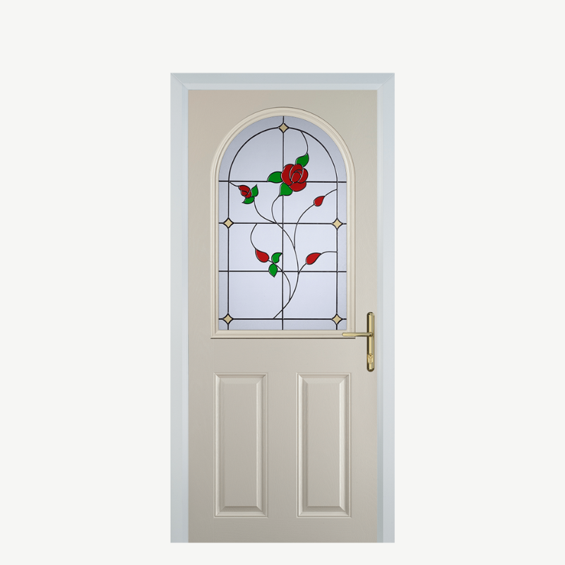 Introducing the Door E 2 Panel 1 Arch Cream English Rose, an exquisite addition to your home's entrance that combines elegance with security. This beautifully designed composite front door not only enhances your curb appeal but also provides superior insulation and durability.