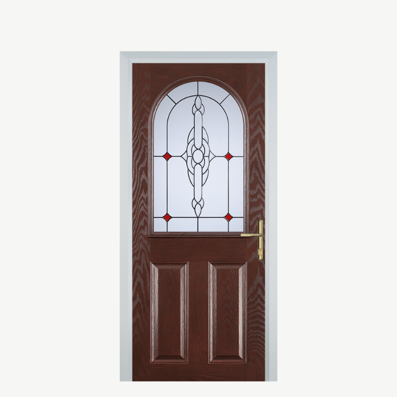 Introducing the Door E 2 Panel 1 Arch in Dark Wood with a stunning Crystal Bohemia Red finish, a perfect blend of elegance and durability for your entrance. This striking composite front door not only enhances your home's curb appeal but also provides security and insulation, making it an essential addition to any property.