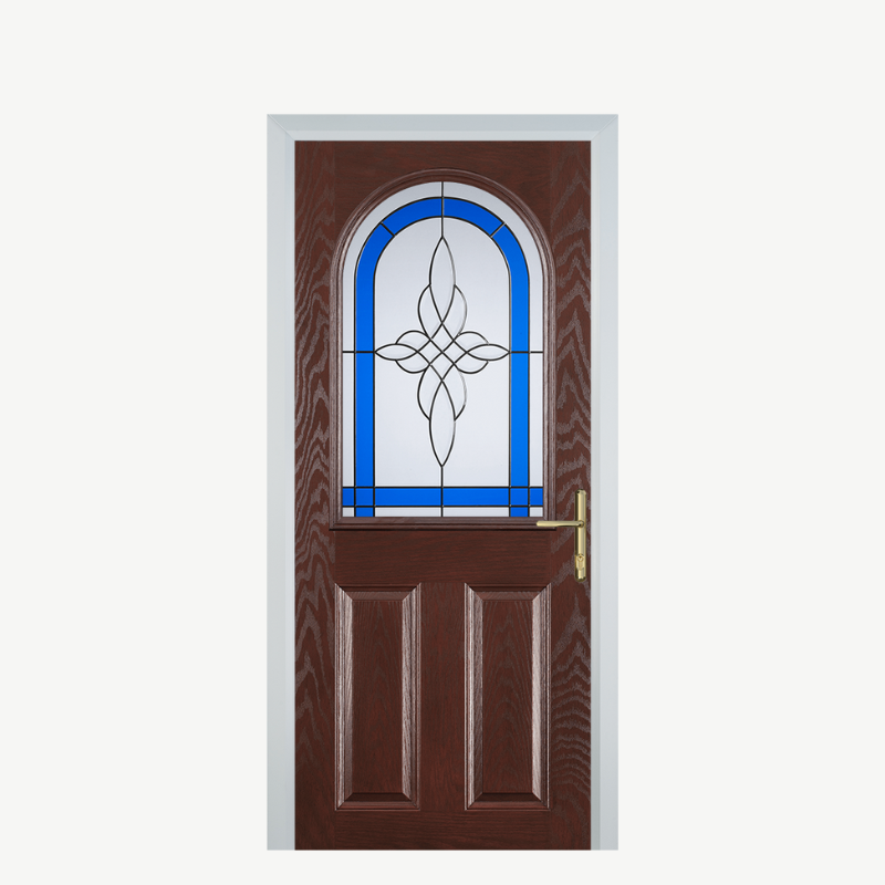 Introducing the Door E 2 Panel 1 Arch in Dark Wood with Crystal Harmony Blue, a stunning addition to your home that combines elegance and durability. This exquisite front door not only enhances your curb appeal but also provides a secure entryway, making it ideal for any modern residence.