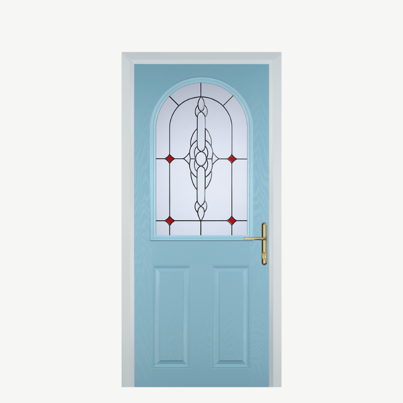 Introducing the Door E 2 Panel 1 Arch in a stunning Duck Egg Blue, complemented by a distinctive Crystal Bohemia Red accent. This composite front door is not just a functional entryway; it’s a statement piece that enhances the aesthetic appeal of your home. Perfectly blending style and security, this door is designed to make a lasting impression.