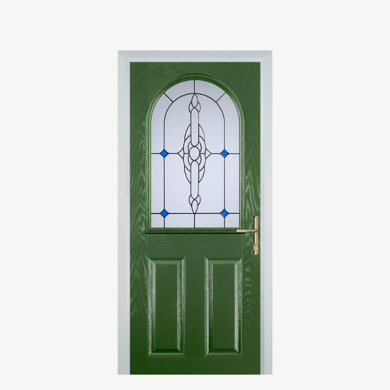 Introducing the Door E 2 Panel 1 Arch in a stunning Fern Green Crystal Bohemia Blue finish, a perfect blend of style and functionality. This composite front door is designed to enhance your home's curb appeal while providing excellent durability and security. An ideal choice for homeowners seeking to make a statement.